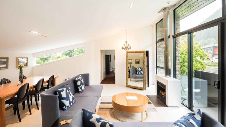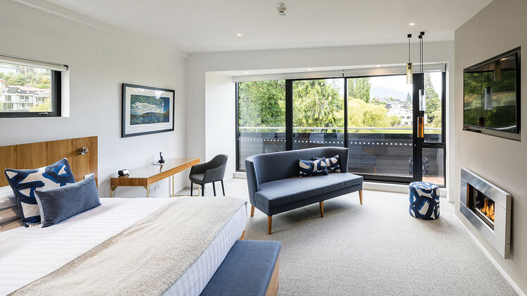 An indulgent, suite-style room with views across the park towards Queenstown’s Remarkables mountain range.